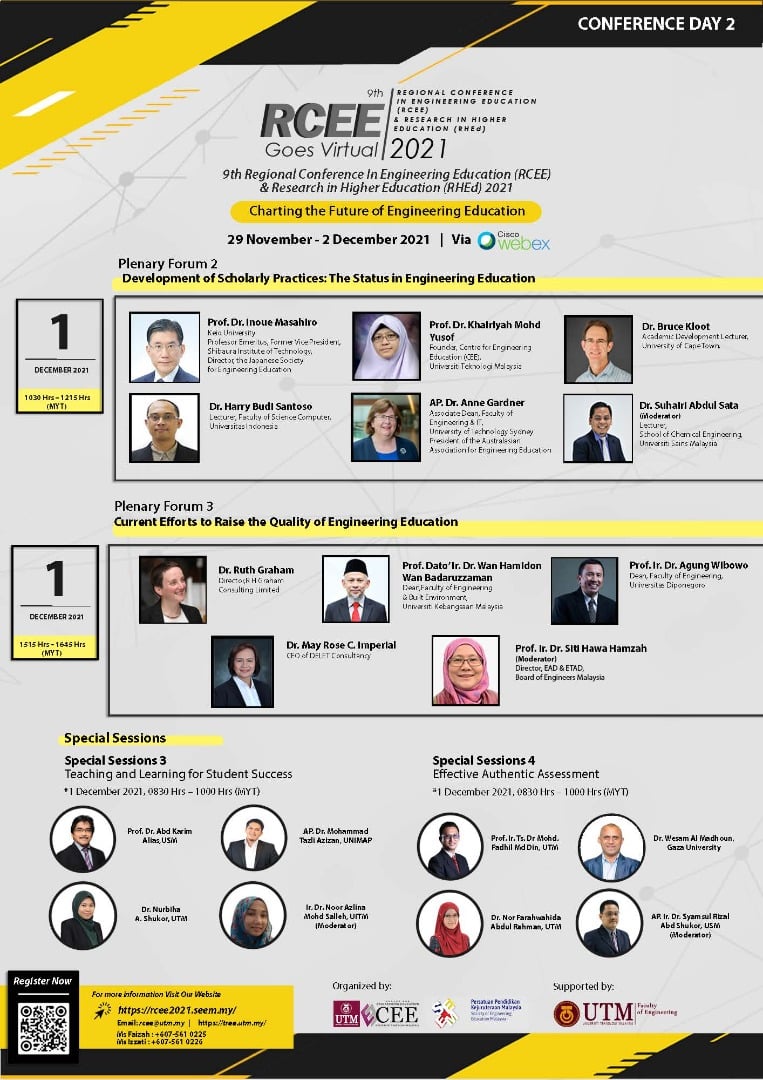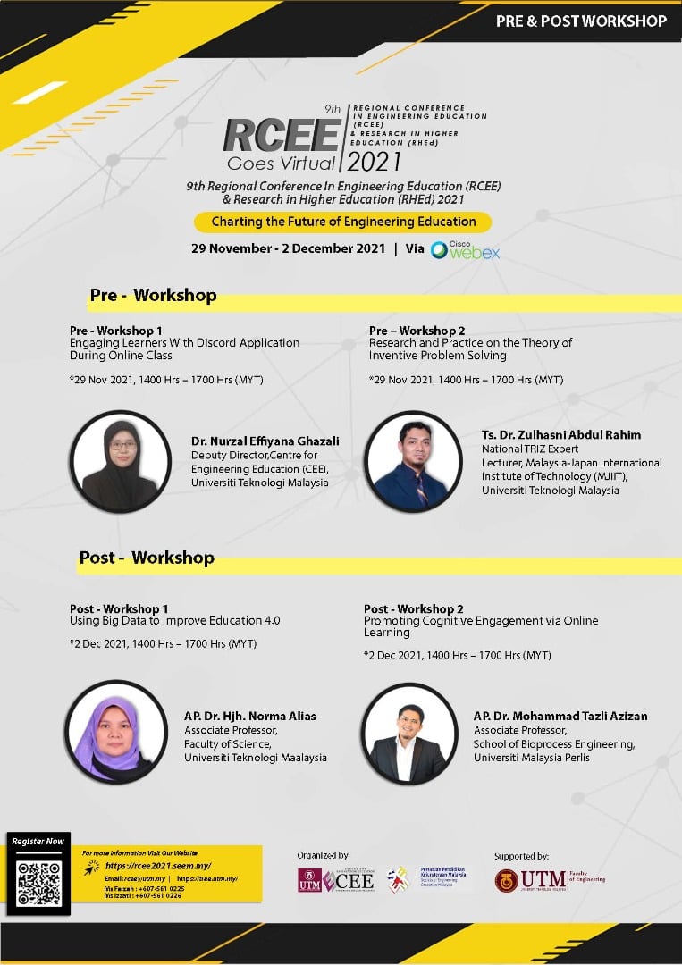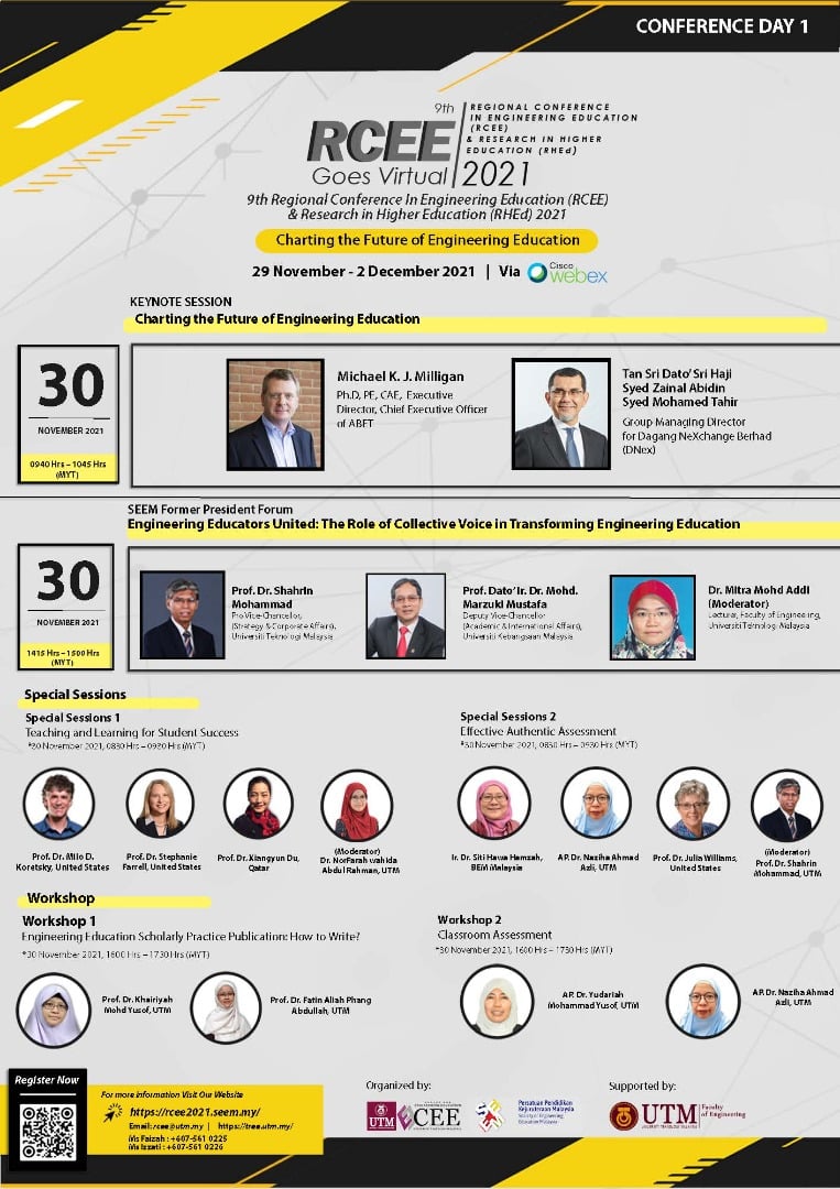 Come and join our engineering education community in the 9th Regional Conference on Engineering Education & Research in Higher Education 2021 (RCEE 2021) from 30th November to 1st December 2021. RCEE is a signature event which has been successfully organized by the Centre for Engineering Education, Universiti Teknologi Malaysia since 2007.
