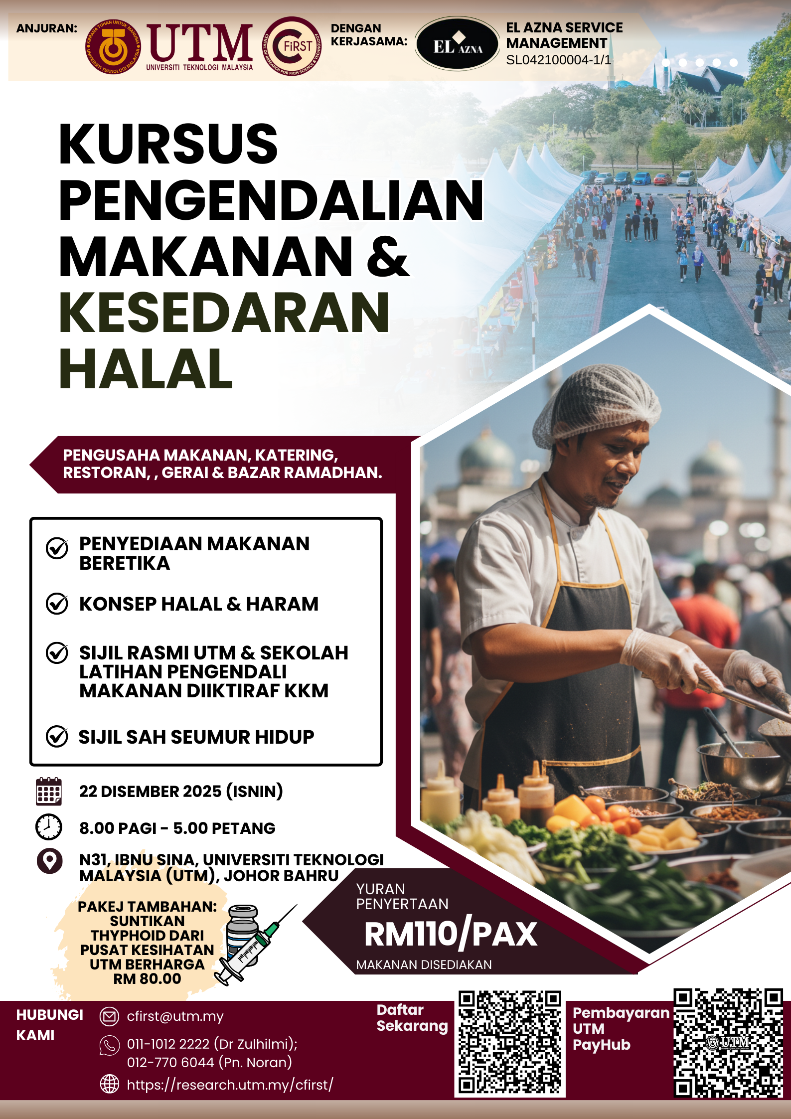 UTM–CFiRST menjemput anda menyertai kursus ini bagi melengkapkan diri dengan ilmu keselamatan makanan, kebersihan, dan pematuhan Halal.