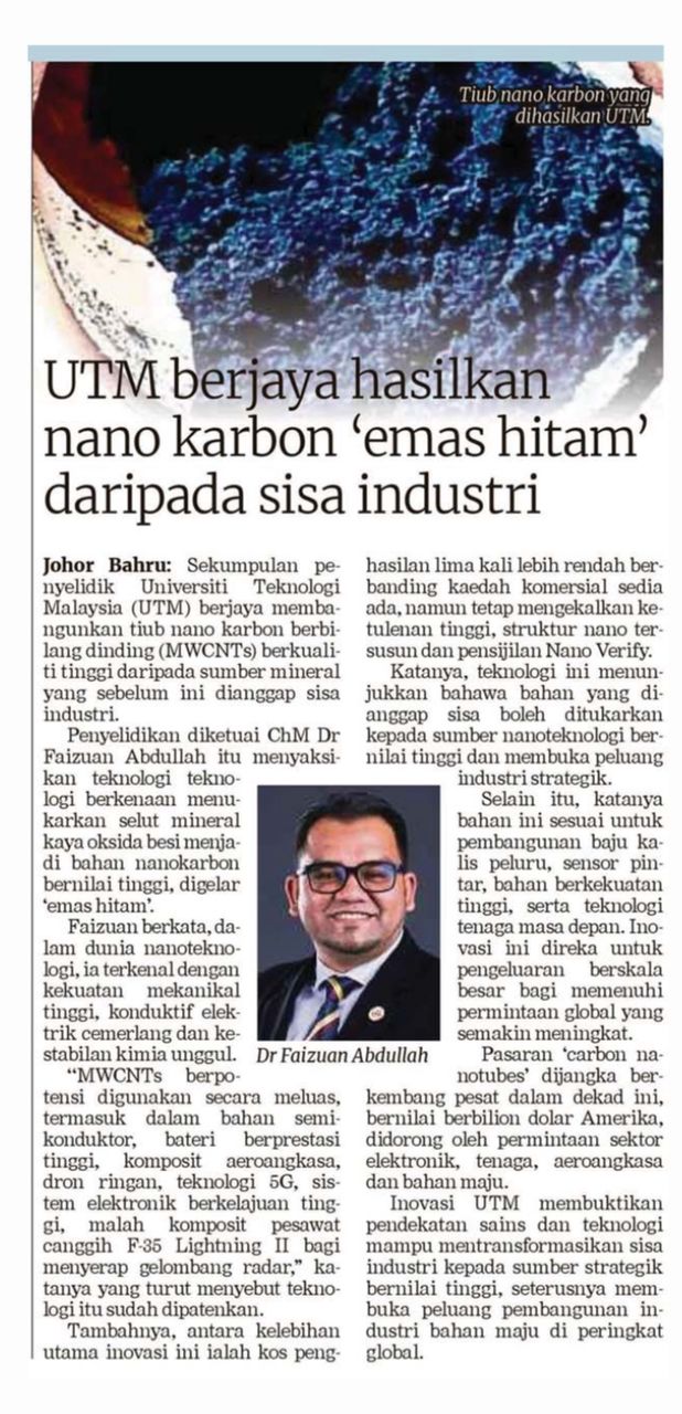 CSNano mengucapkan tahniah atas liputan media berkaitan kejayaan Dr. Faizuan Abdullah menghasilkan tiub nano karbon berbilang dinding (MWCNTs) berkualiti tinggi daripada sisa industri. Inovasi ini menukarkan bahan buangan mineral kepada nanokarbon bernilai tinggi dengan kekuatan mekanikal, kekonduksian elektrik dan kestabilan kimia yang cemerlang. Teknologi ini juga menawarkan kos penghasilan lebih rendah sambil mengekalkan kualiti struktur tinggi, sekali gus membuka potensi aplikasi dalam elektronik, penyimpanan tenaga, aeroangkasa, sensor dan bahan maju.