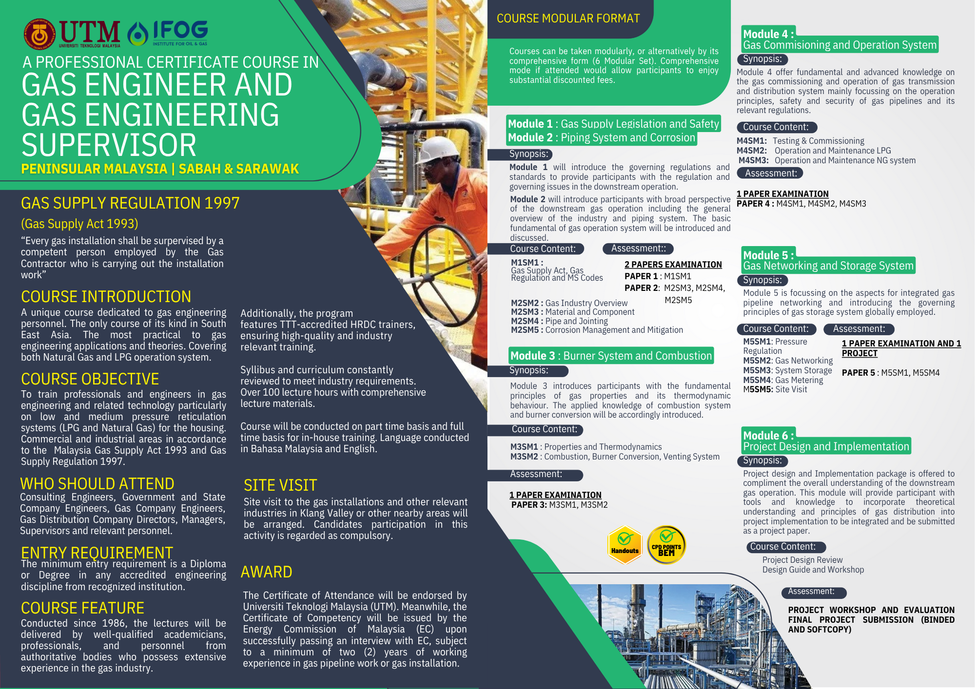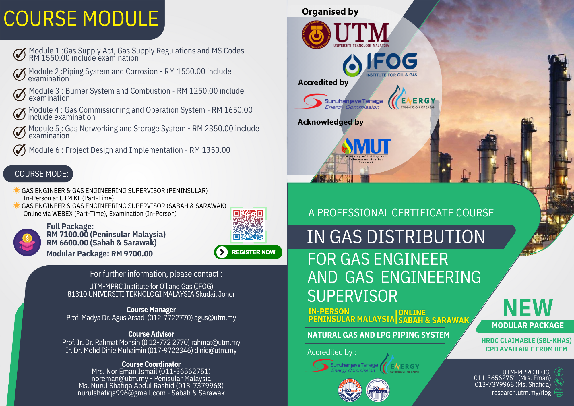 Certificate of attendance will be endorsed by Universiti Teknologi Malaysia (UTM). Meanwhile, certificate of Competency will be issued by the Energy Comission of Malaysia (EC) after passing interview with EC with minimum 2 years of working experience in gas pipeline work or gas installation.