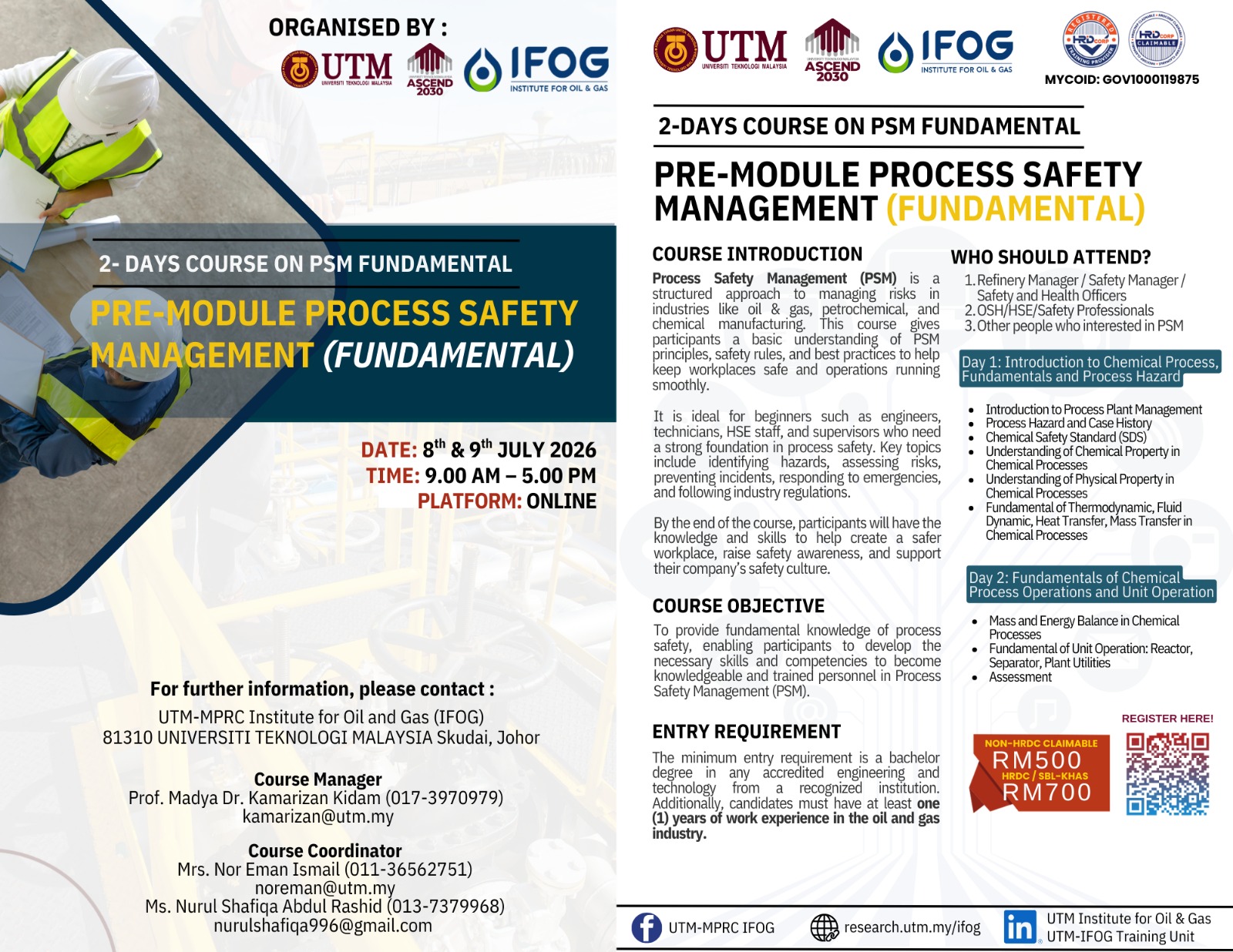 For inquiries about our latest courses and enrollment procedures, kindly reach out to our dedicated secretariat, Mrs. Eman, at 011-36562751 or Ms. Shafiqa 013-7379968. Stay ahead of the curve with UTM IFOG! Explore new horizons with UTM-MPRC Institute for Oil & Gas. Join our community of passionate learners and embark on a journey of knowledge and discovery. Take the next step towards a successful career in the oil and gas industry. Your future starts here at UTM-MPRC IFOG!