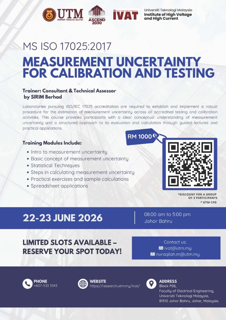 We are glad to announce that UTM-IVAT High Voltage and High Current Institute, Universiti Teknologi Malaysia will be organize a course on MS ISO/IEC 17025:2017 Laboratory QMS- Measurement Uncertainty for Calibration and Testing Laboratory as per detail below: