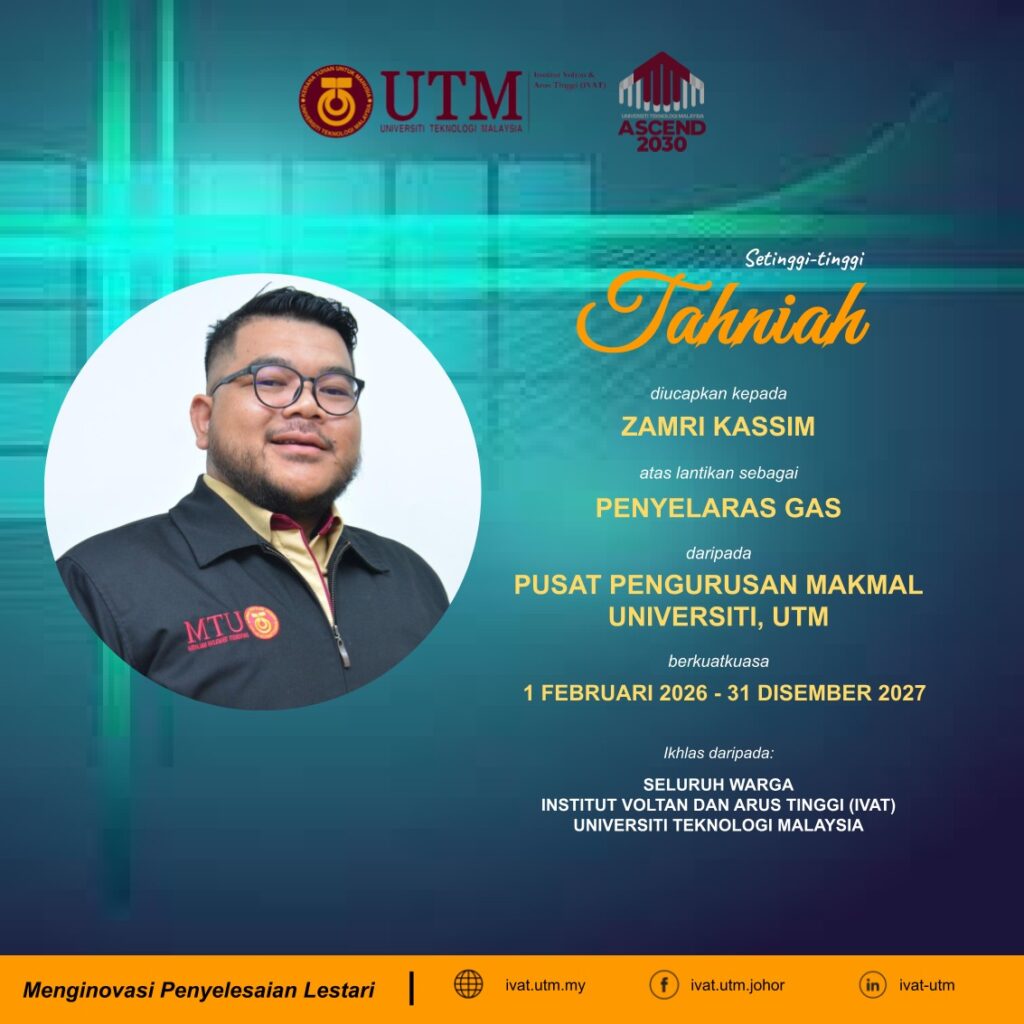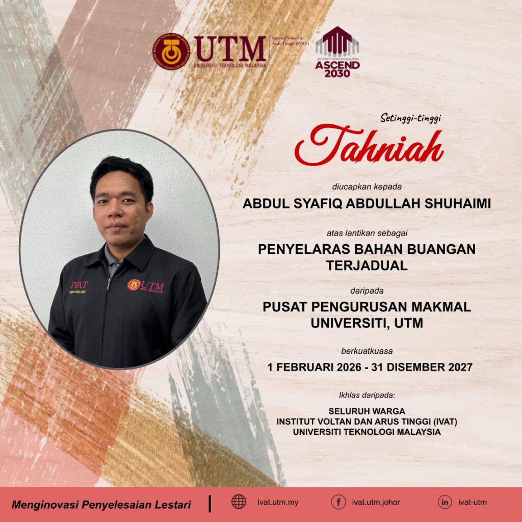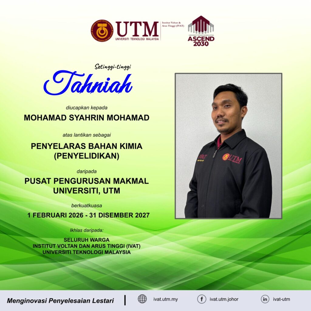 Tahniah dan Selamat Menjalankan Tugas kepada Encik Mohamad Syahrin Mohamad (Penyelaras Bahan Kimia), Encik Zamri Bin Kassim (Penyelaras Gas Silinder) serta Encik Abdul Syafiq Bin Abdullah Shuhaimi (Penyelaras Bahan Buangan Terjadual) diatas perlantikan ini. Semoga dengan perlantikan ini, saudara dapat memberikan sumbangan yang terbaik buat IVAT serta memastikan IVAT sentiasa mengikuti peraturan-peraturan yang ditetapkan oleh pihak universiti.