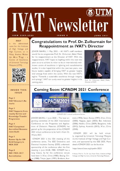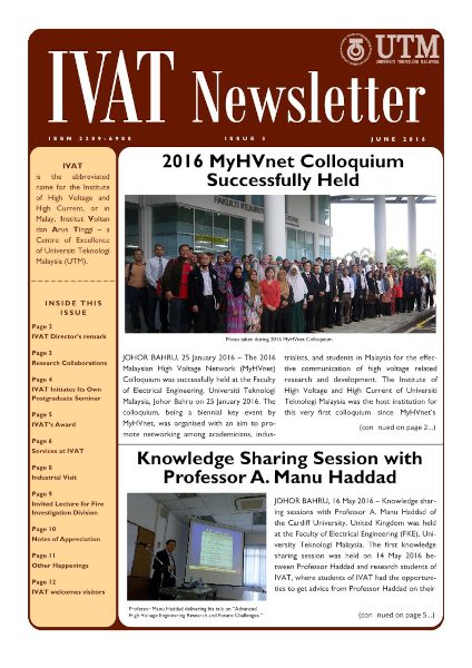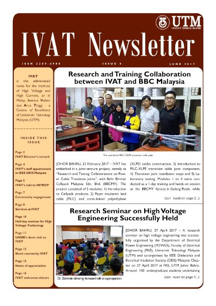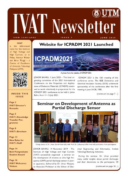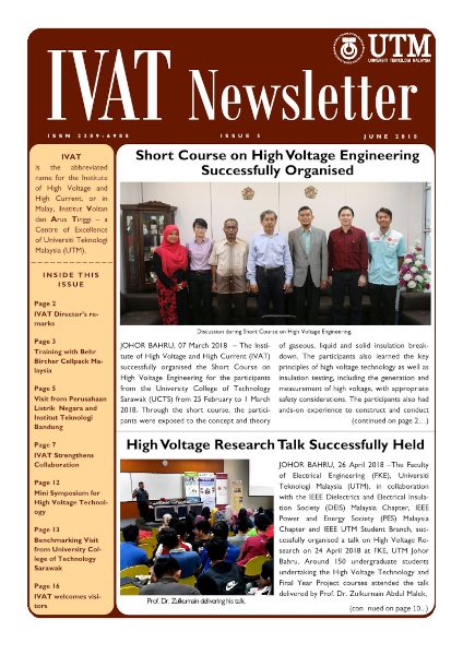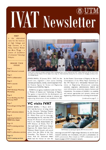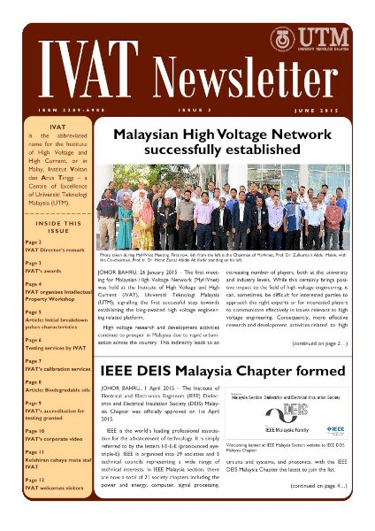 © Copyright of contents in IVAT Newsletter belongs exclusively to the Institute of High Voltage and High Current, Universiti Teknologi Malaysia. The copyright covers the rights to reproduce the newsletter, including reprints, electronic reproductions or any other reproductions of similar nature.