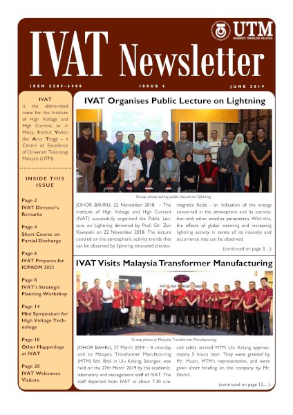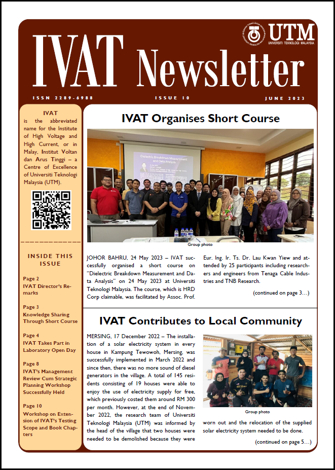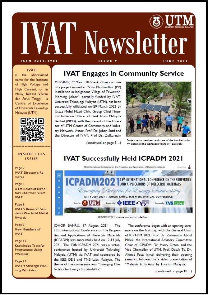 IVAT Newsletter is an annual newsletter published by the Institute of High Voltage and High Current, Universiti Teknologi Malaysia, with ISSN no. 2289-6988.