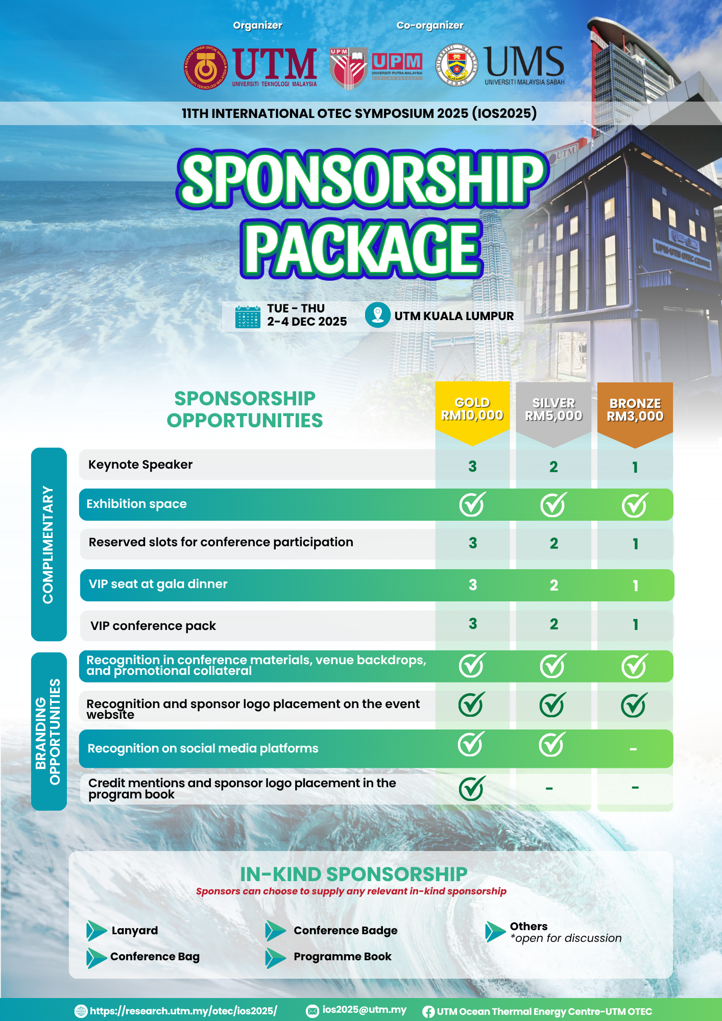 The11th International OTEC Symposium 2025 (IOS2025) brings together thought leaders, industry professionals, researchers, and policymakers to engage in impactful dialogue and develop actionable strategies focused on Ocean Thermal Energy Driven projects. Your sponsorship will not only enhance your brand visibility but also reflect your commitment on OTEC and to sustainable development and responsible business practices