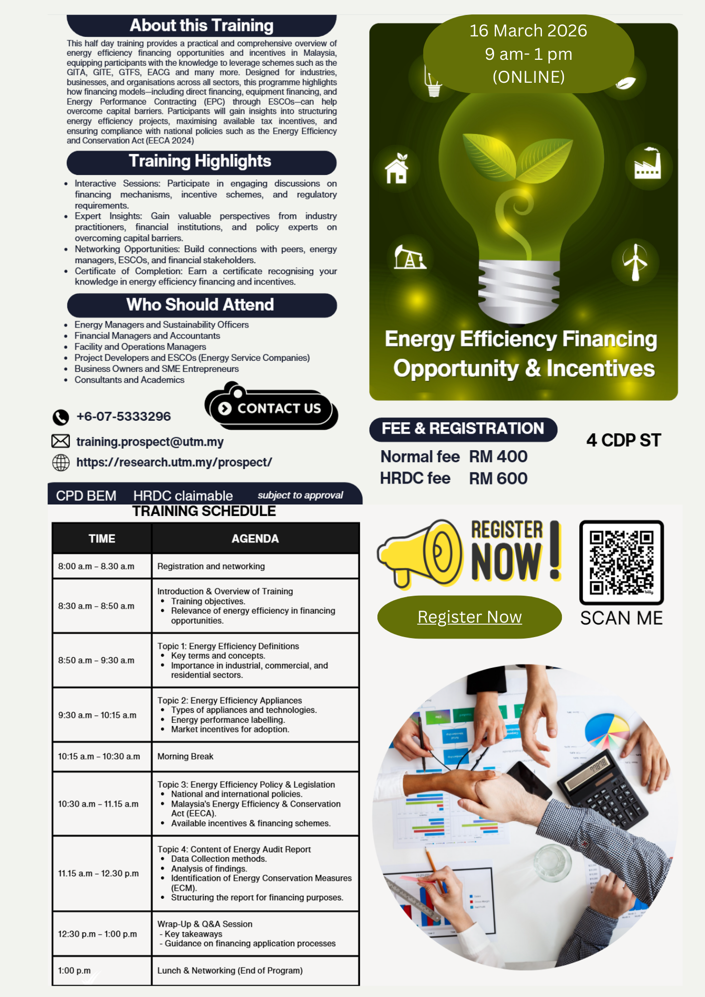 Universiti Teknologi Malaysia (UTM) is organising an online training program titled “Energy Efficiency Financing Opportunity & Incentives” on 16 March 2026 (9:00 a.m. – 1:00 p.m.). This half-day training provides a practical and comprehensive overview of financing opportunities and incentives available for energy efficiency projects in Malaysia.